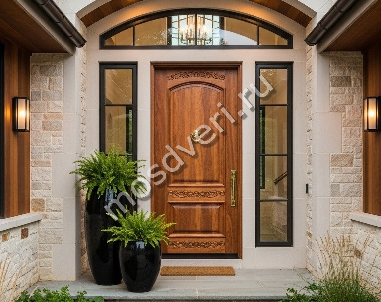 Большая входная дверь в дом светло-коричневая — совмещает эстетичность и высокую надёжность.
