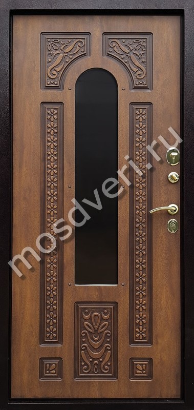 Темно-коричневая входная парадная железная дверь с ковкой в дом — совмещает эстетичность и высокую надёжность.