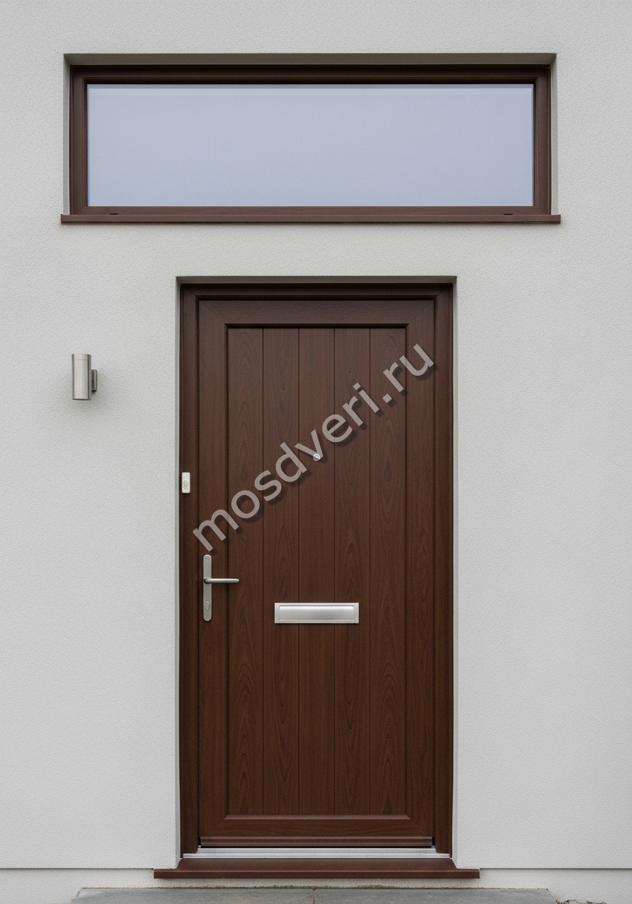 Высокая входная дверь в частный дом коричневого цвета — объединяет эстетичность и высокую надёжность.