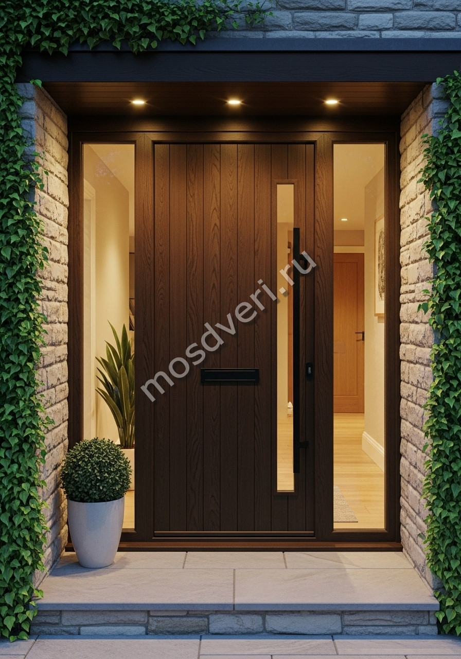 Высокая входная дверь в дом коричневая со стеклом — совмещает эстетичность и превосходные защитные характеристики.